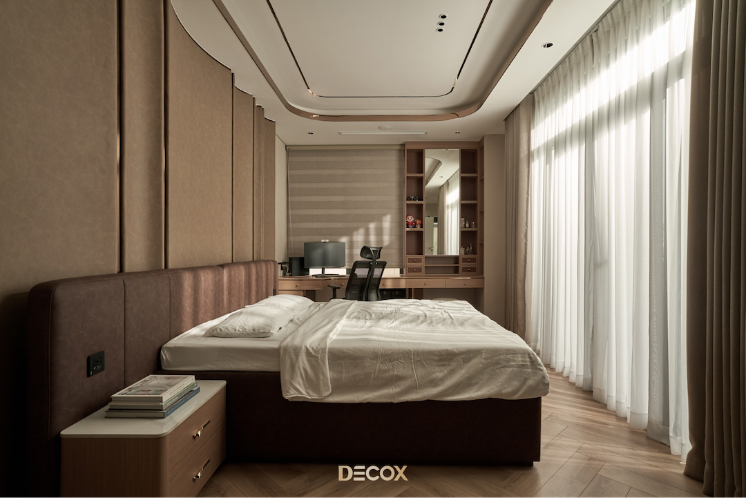 Với đặc điểm diện tích hạn chế nhà ống, phòng ngủ nhà ống nằm tại vị trí giữa nhà chính là sự thiếu hụt ánh sáng tự nhiên và luồng khí tươi. Do đó, thiết kế cần ưu tiên việc tích hợp các ô cửa sổ lấy sáng từ khoảng thông tầng hoặc giếng trời, khai phóng không gian cho phòng ngủ nhà ống. Đồng thời, hệ giường tích hợp hộc kéo thông minh và hệ tủ âm tường kịch trần, kết hợp tông màu trung tính cùng hệ thống ánh sáng vàng ấm và rèm vải mềm, tạo nên những mặt phẳng kiến trúc liền mạch, tôn lên vẻ đẹp của chất liệu nội thất giúp căn phòng trở nên rộng rãi và ấm cúng hơn.