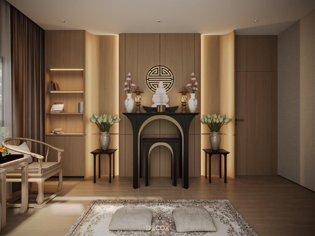 Nhà 1 tầng: thiết kế phòng thờ kết tại vị trí trang trọng nhất của không gian sinh hoạt chung, thường được bố trí ở cuối phòng khách, áp sát mảng tường