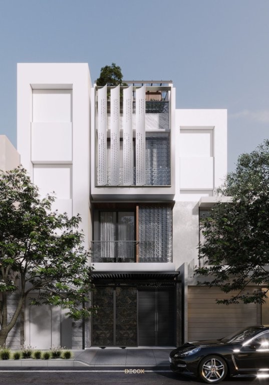 Với mặt tiền chỉ vẻn vẹn 4m, thiết kế nhà ống 3 tầng là bài toán điều phối ánh sáng tự nhiên thông qua hệ thống giếng trời và các khoảng thông tầng. Ngôn ngữ thiết kế tập trung không gian mở tối giản với hệ thống lam chắn nắng, ban công kính và những mảng xanh treo tường được ưu tiên để tạo hiệu ứng 'ăn gian' chiều ngang. Bố trí trục giao thông đứng với điểm nhấn hệ cầu thang xương cá hoặc kính thanh mảnh đặt giữa nhà.