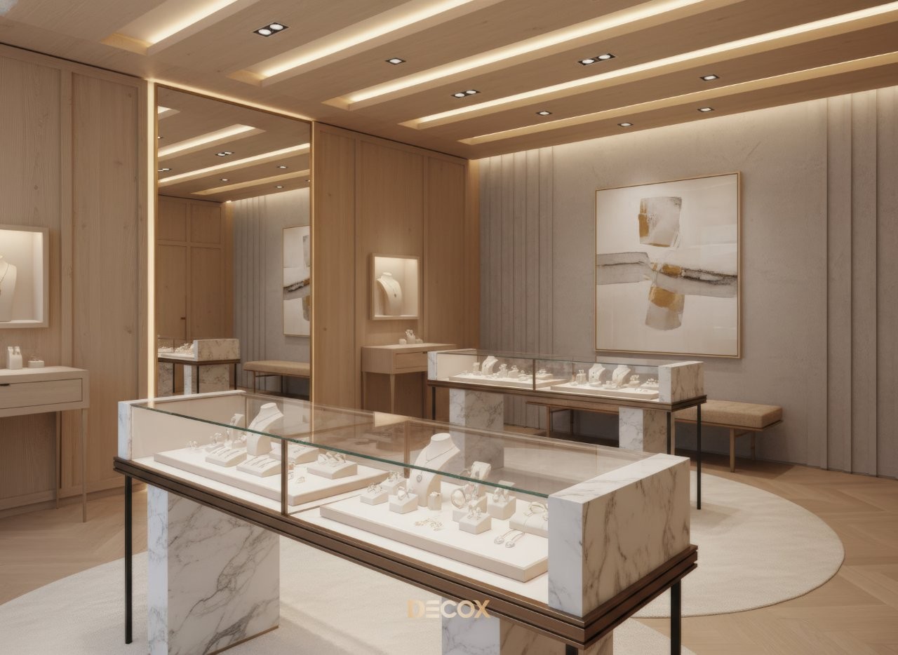 Ưu tiên các vật liệu có nguồn gốc tự nhiên và độ bền cao cấp, đá mặt nhám hoặc gỗ bản lớn đã xử lý bề mặt, lụa tơ tằm ở các khay lót trang sức. Hệ thống đèn rọi điểm với chỉ số CRI > 97 được tính toán góc chiếu hẹp kết hợp ánh sáng Ambient trong các khe trần, hệ nan gỗ kiến tạo nên những vệt sáng "Komorebi" huyền ảo, nâng tầm trải nghiệm mua sắm.