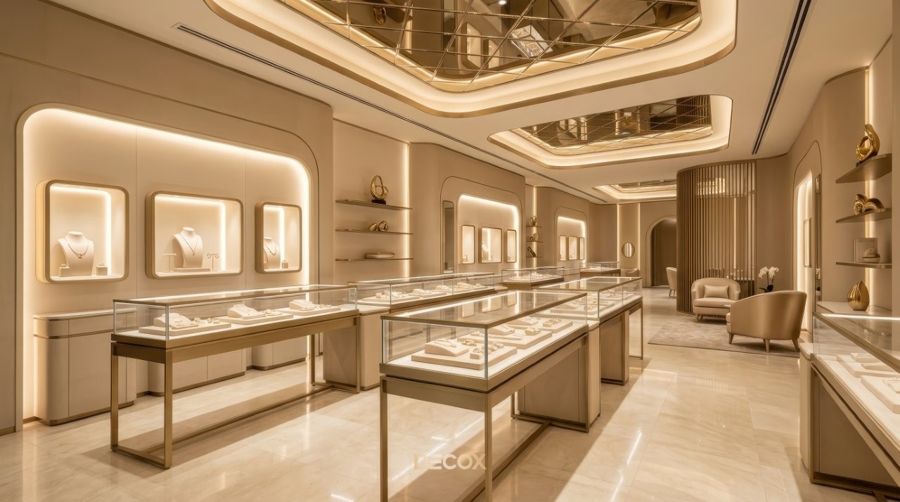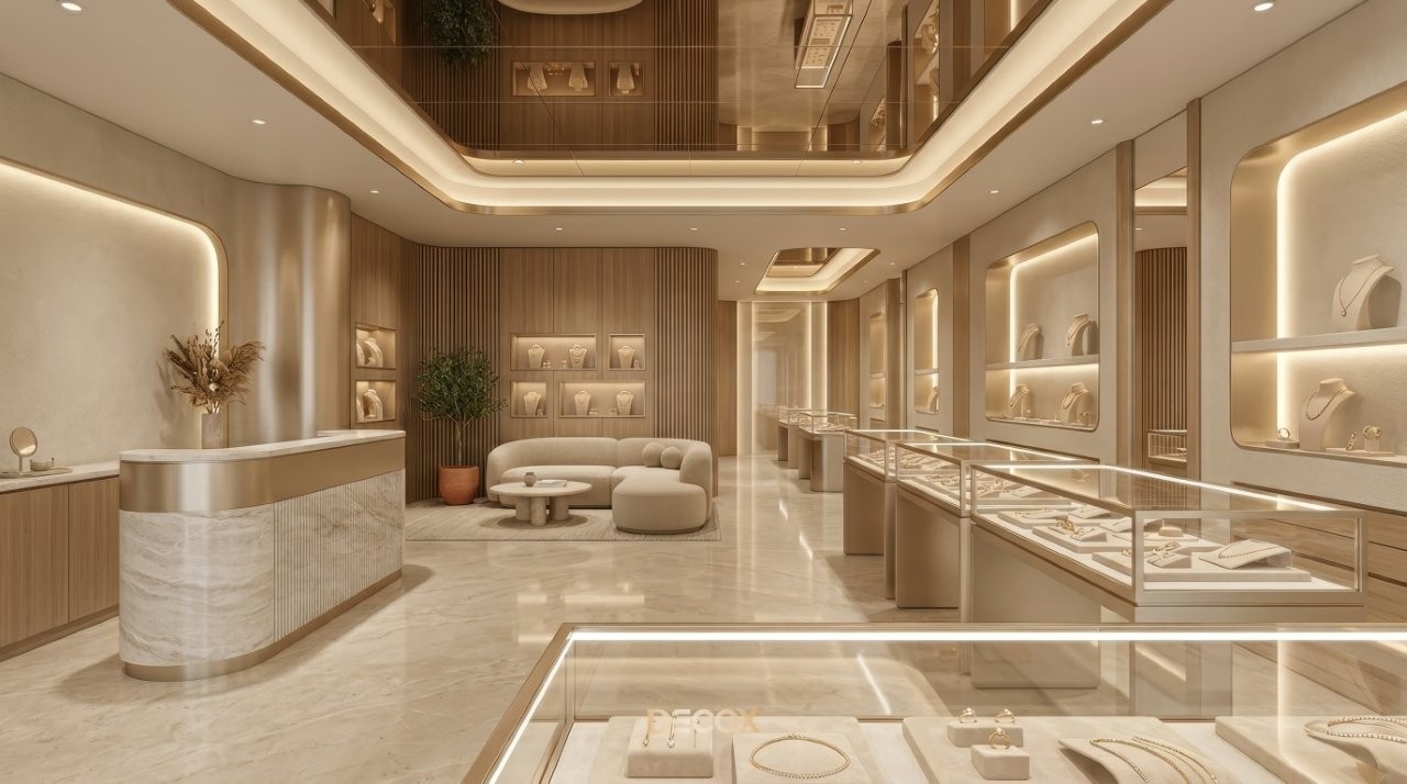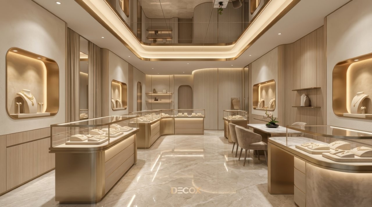 Các mẫu thiết kế tiệm vàng trang sức đẹp, nội thất sang trọng 2026