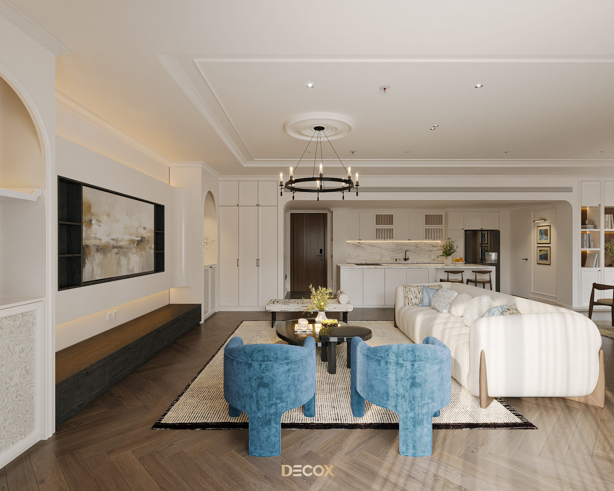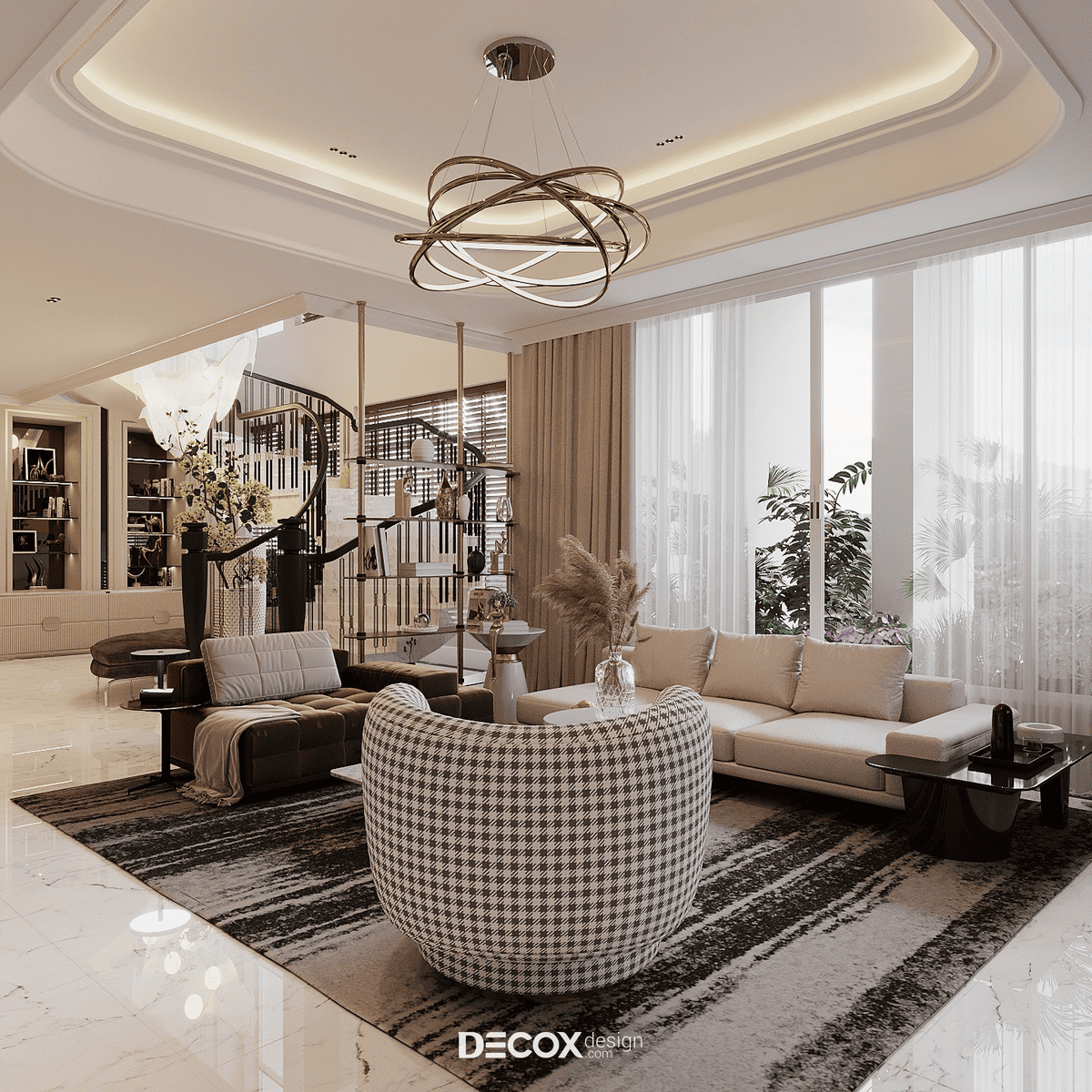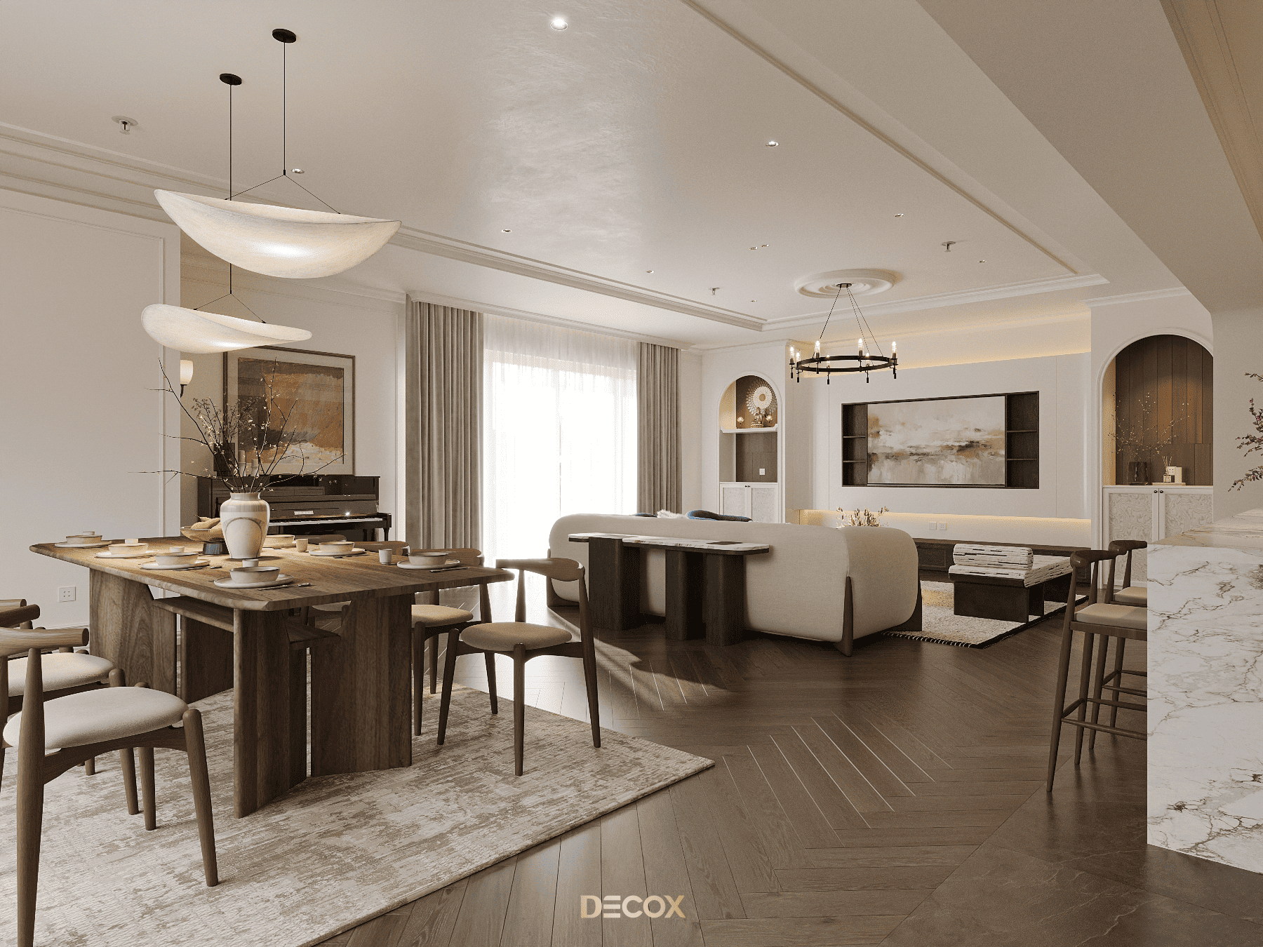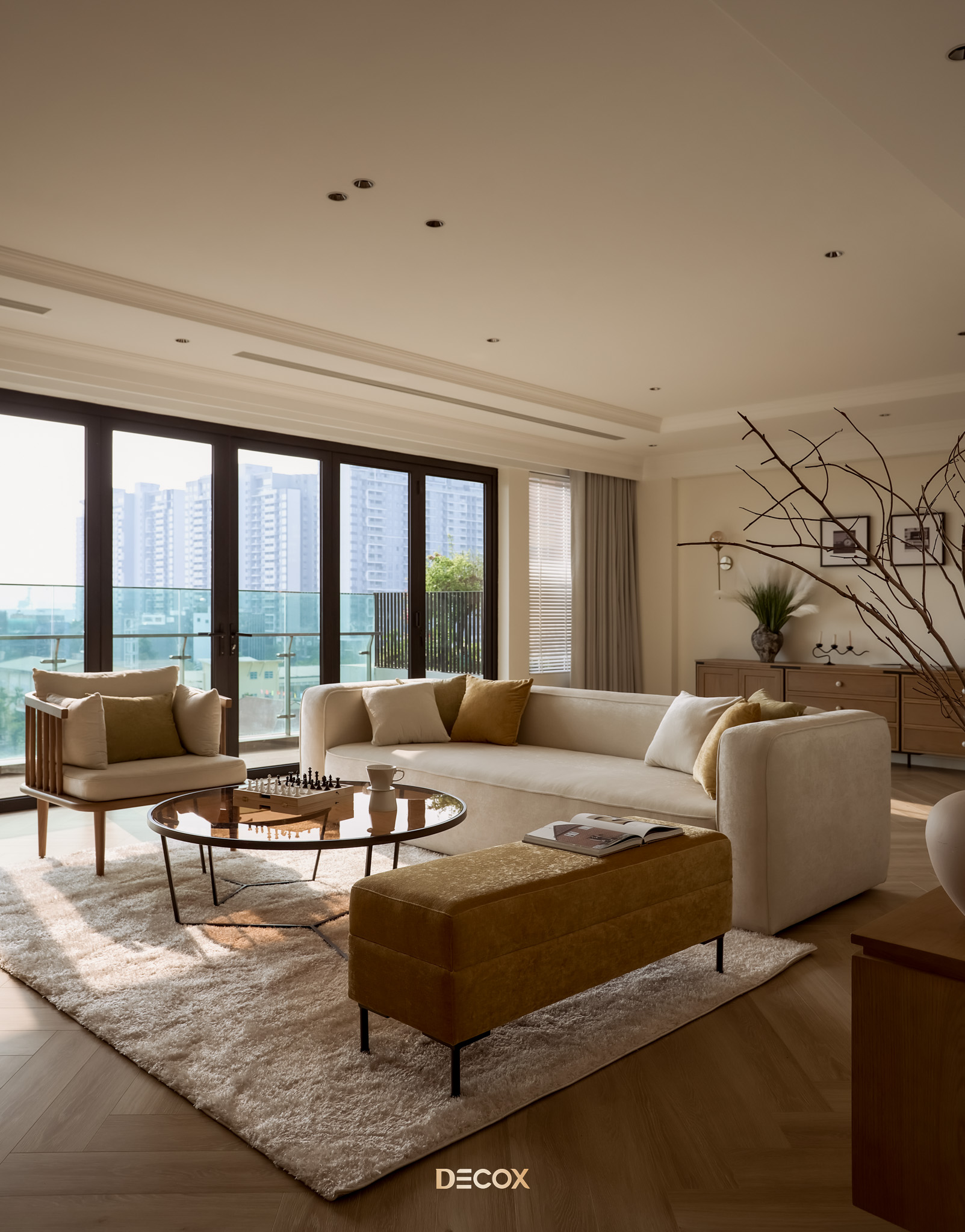 Decox tin rằng, một thiết kế phòng khách đẹp không nằm ở sự phô diễn hình thức, mà ở cách không gian được tổ chức để con người cảm thấy dễ chịu khi bước vào, bình yên khi ở lại và gắn bó theo thời gian. Hãy cùng đi sâu hơn vào các giải pháp không gian qua bộ sưu tập Thiết kế nội thất phòng khách hiện đại của Decox. Tại đây, gia chủ sẽ tìm thấy những không gian được kiến tạo để tôn vinh sự kết nối: Kết nối các thành viên bằng sự tiện nghi, kết nối con người với thiên nhiên bằng không gian mở, và kết nối cảm xúc bằng ngôn ngữ của ánh sáng.