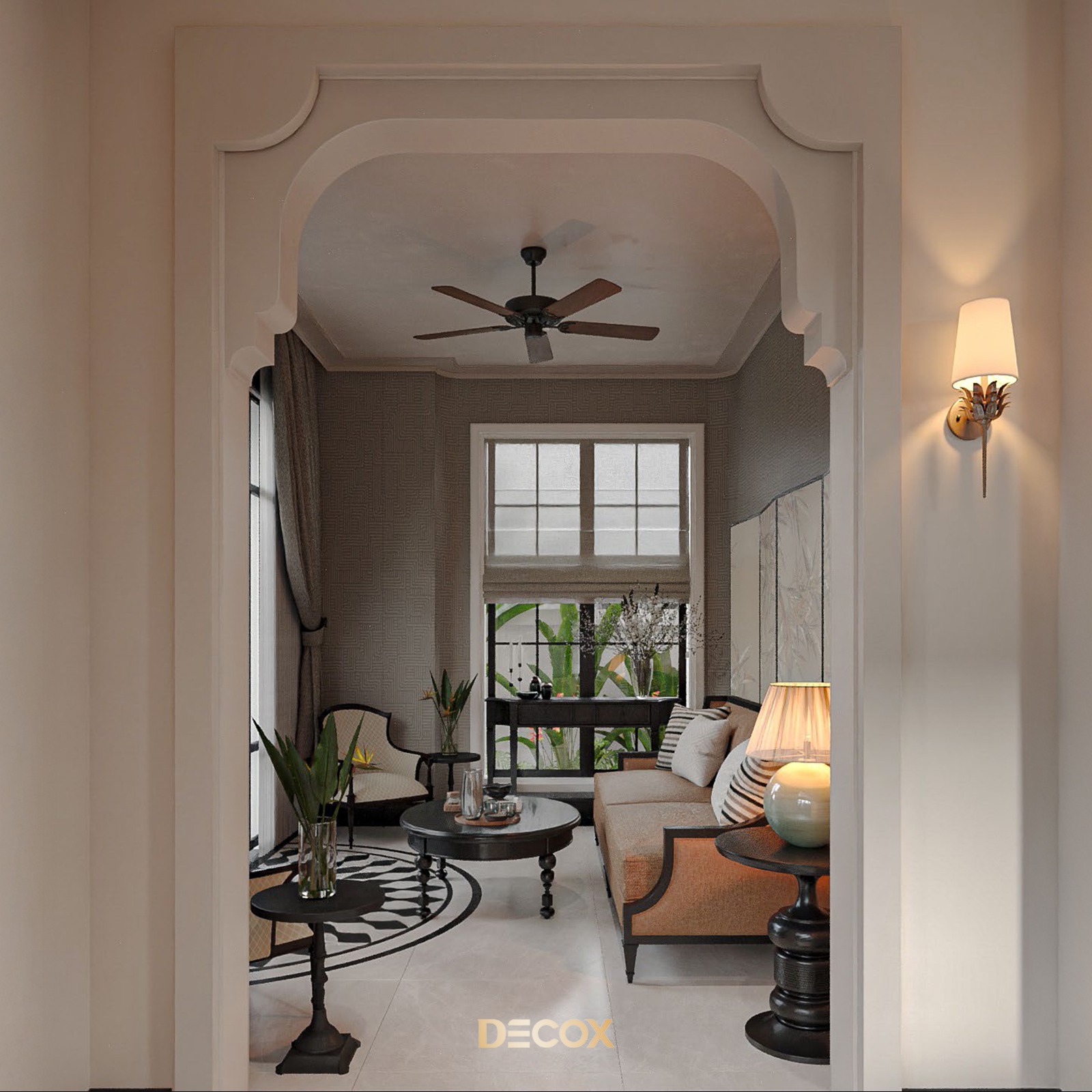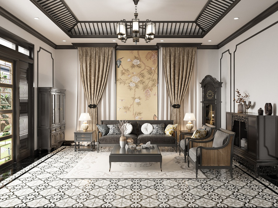 Phong cách Indochine mang lại cảm giác ấm áp và có chiều sâu nhờ việc sử dụng các vật liệu có kết cấu bề mặt rõ rệt, kết hợp với cách xử lý sáng – tối có kiểm soát. Bản sắc Á Đông được thể hiện thông qua vật liệu tự nhiên, tỷ lệ không gian gần gũi, các đường cong mềm và chi tiết thủ công mang tính truyền thống, thay vì phô diễn bằng trang trí cầu kỳ. Phòng khách thường được tổ chức theo các lớp không gian liên tiếp, dẫn dắt từ khu vực vào nhà đến không gian tiếp khách rồi mở dần ra những khoảng nhìn hướng thiên nhiên, tạo cảm giác chuyển tiếp nhẹ nhàng theo trục di chuyển. Nội thất ưu tiên dáng thấp, kết hợp vòm, nan gỗ, mây tre hoặc gạch bông như những điểm nhấn có chọn lọc.