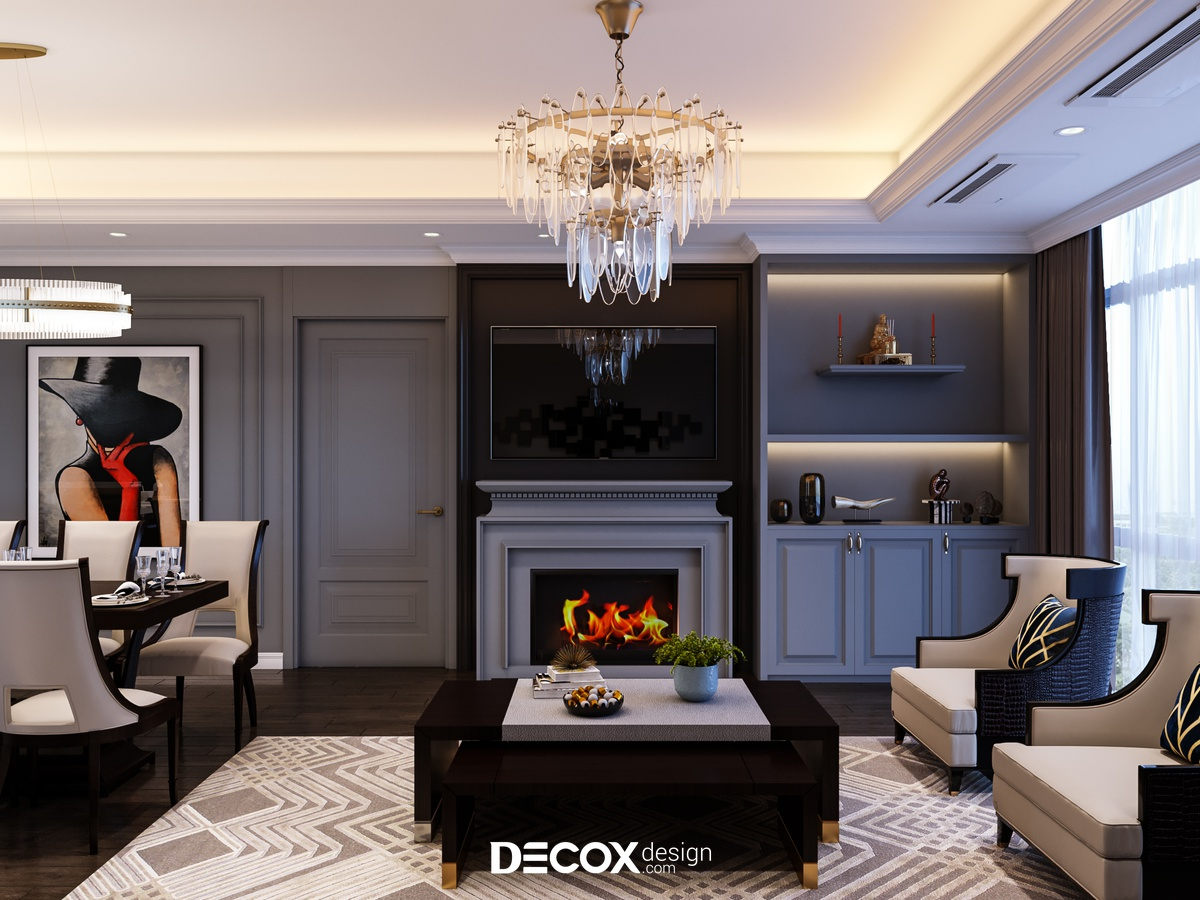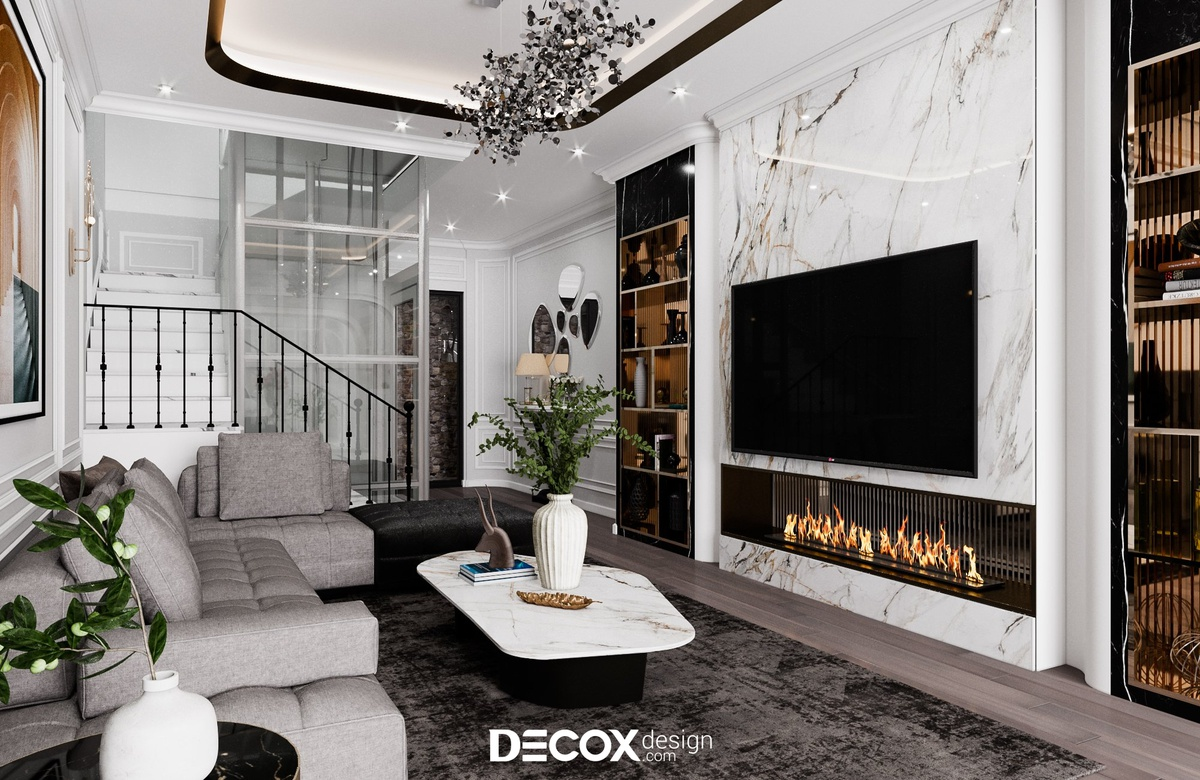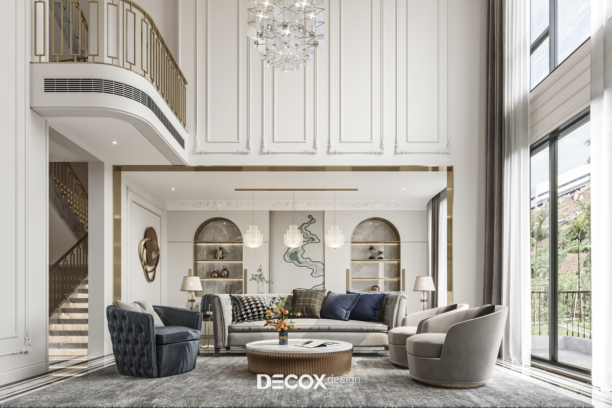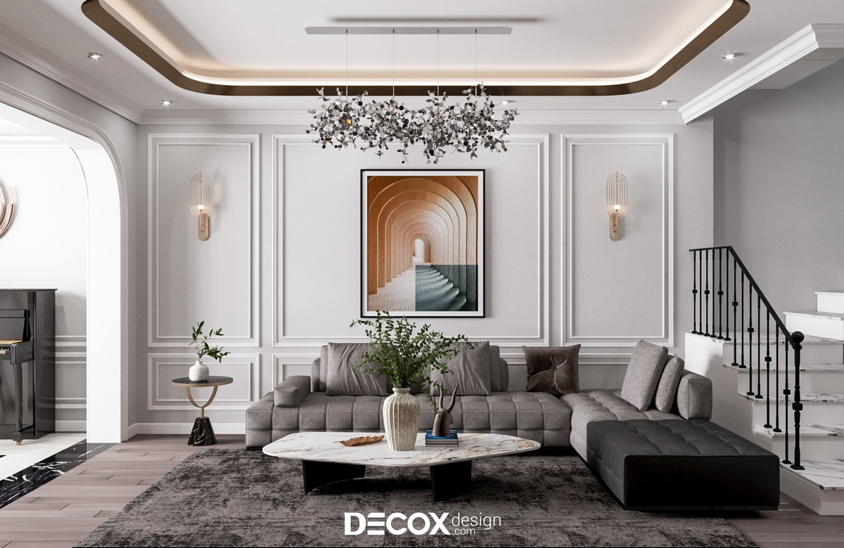Phong cách tân cổ điển tạo dấu ấn bằng sự chặt chẽ trong tỷ lệ và trật tự không gian. Khi các yếu tố được sắp đặt theo bố cục đối xứng, phòng khách hình thành một trục thị giác rõ ràng, với tâm điểm là bộ sofa, hệ tivi hoặc đèn chùm. Cách tổ chức này mang lại cảm giác chỉn chu và ổn định, phù hợp với những không gian đề cao tính chuẩn mực.