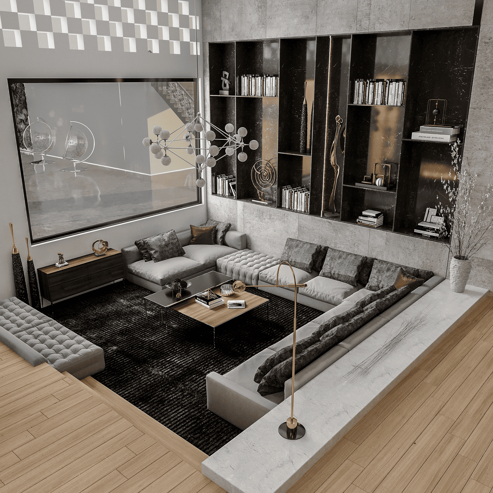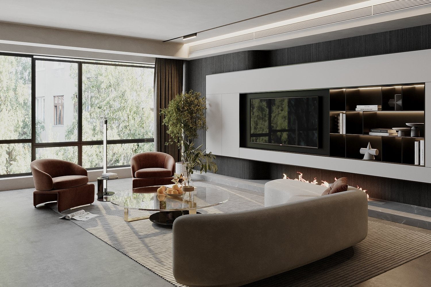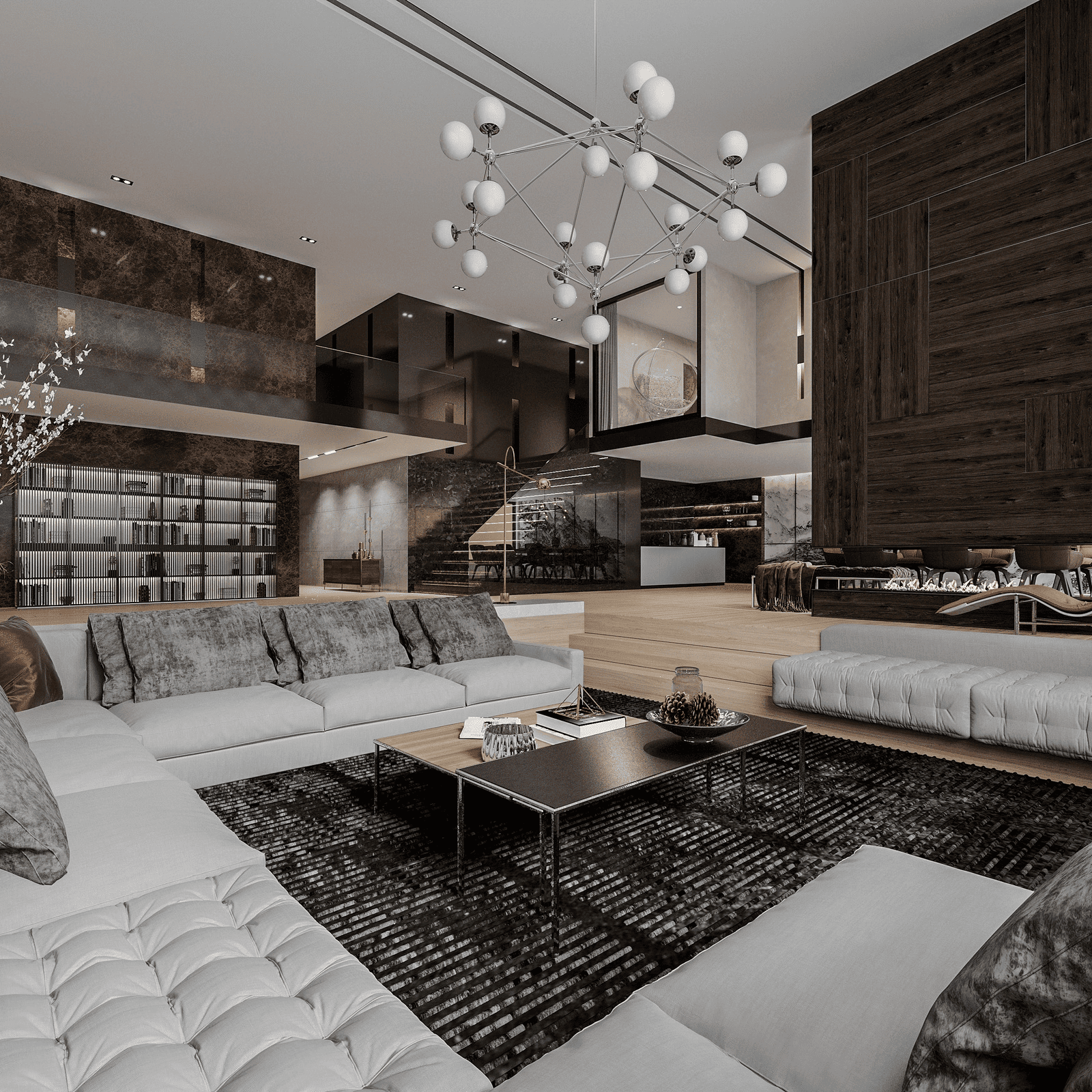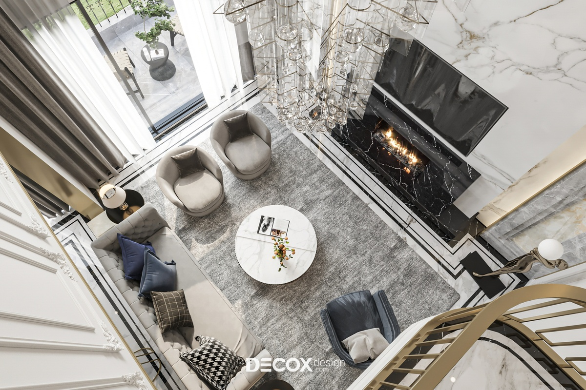 Sofa được bố trí tại trung tâm tầng trệt, đặt lùi vừa đủ khỏi trục giao thông và neo bằng thảm lớn, nhằm giữ sự ổn định thị giác và tránh cảm giác “lọt thỏm” trong không gian cao. Phòng khách liên kết trực tiếp với sảnh và cầu thang, tạo dòng di chuyển mạch lạc và liên tục. Nội thất ưu tiên hình khối lớn, tiết chế chi tiết, sử dụng đá, kính và kim loại kết hợp gỗ để cân bằng cảm giác lạnh của trần cao.