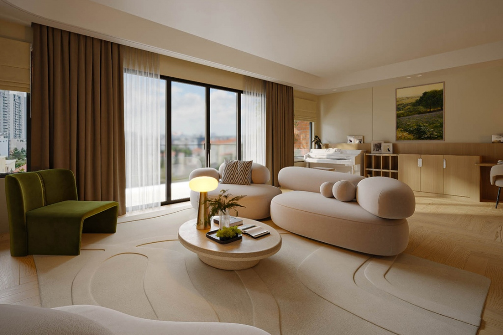 Bảng màu trắng - be - xám nhạt củng cố cảm giác sáng và thoáng, trong khi sự ấm áp đến từ các lớp vật liệu mềm như thảm, vải dệt và gỗ, không phải từ trang trí dày. Không gian vì thế giữ được những khoảng trống có chủ đích và tỷ lệ hài hòa. Về bố cục, phòng khách liên kết nhẹ với phòng ăn, hạn chế vách ngăn cứng nhưng vẫn đảm bảo lối đi rõ ràng để vận hành. Trung tâm là cụm ngồi thân mật gồm sofa, ghế đơn và bàn trà, thường xoay quanh cửa sổ lớn hoặc điểm nhìn phục vụ sinh hoạt, nhấn mạnh cảm giác cân bằng và gần gũi trong trải nghiệm sống.