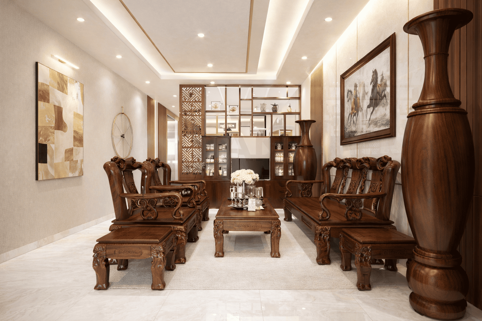 Song song đó, các giải pháp lưu trữ như tủ âm tường hoặc kho nhỏ được tính toán ngay từ giai đoạn đầu nhằm giữ tổng thể gọn gàng và dễ sử dụng. Nhờ diện tích rộng, phòng khách có điều kiện xây dựng kịch bản không gian rõ nét thông qua các mảng vách lớn, tranh khổ lớn hoặc hệ đèn trang trí. Trần được xử lý giật cấp dứt khoát, kết hợp hệ chiếu sáng phân lớp gồm ánh sáng chung, chiếu điểm và chiếu trang trí, giúp không gian đạt được chiều sâu và cảm xúc rõ rệt trong quá trình sử dụng.
