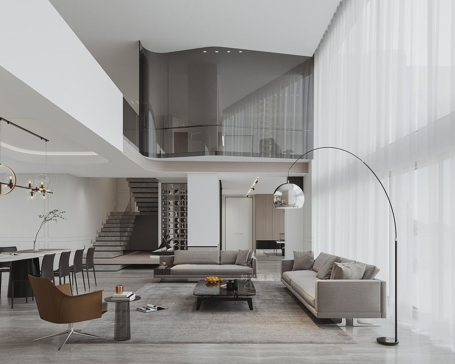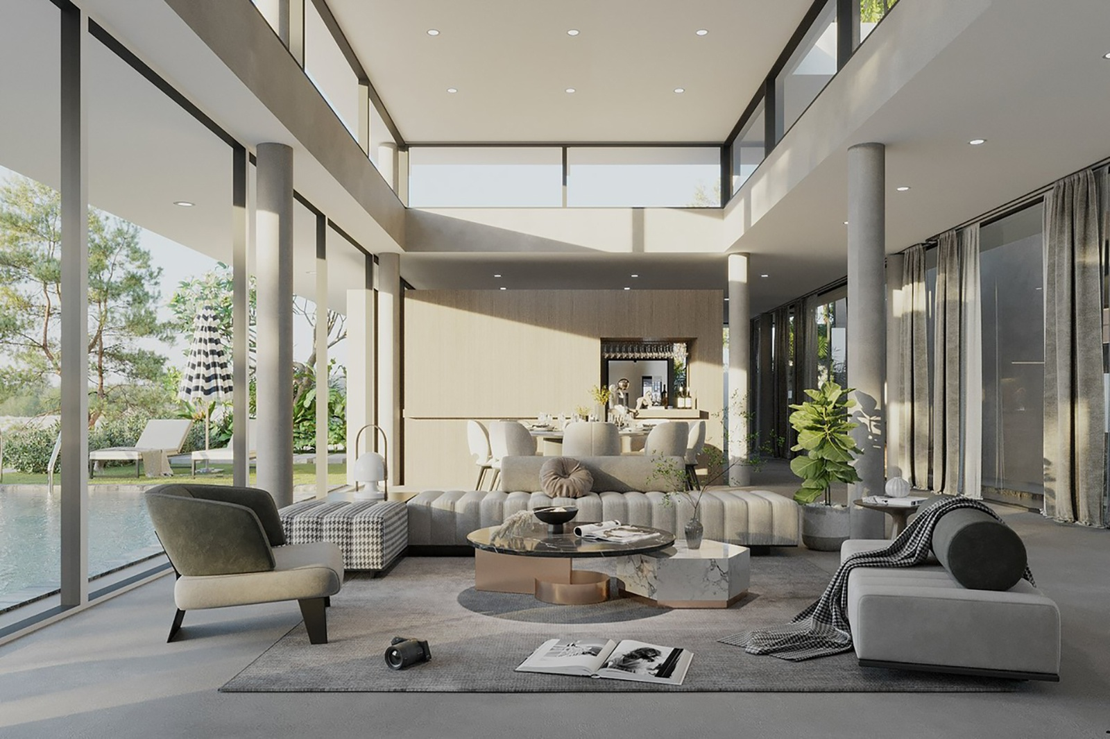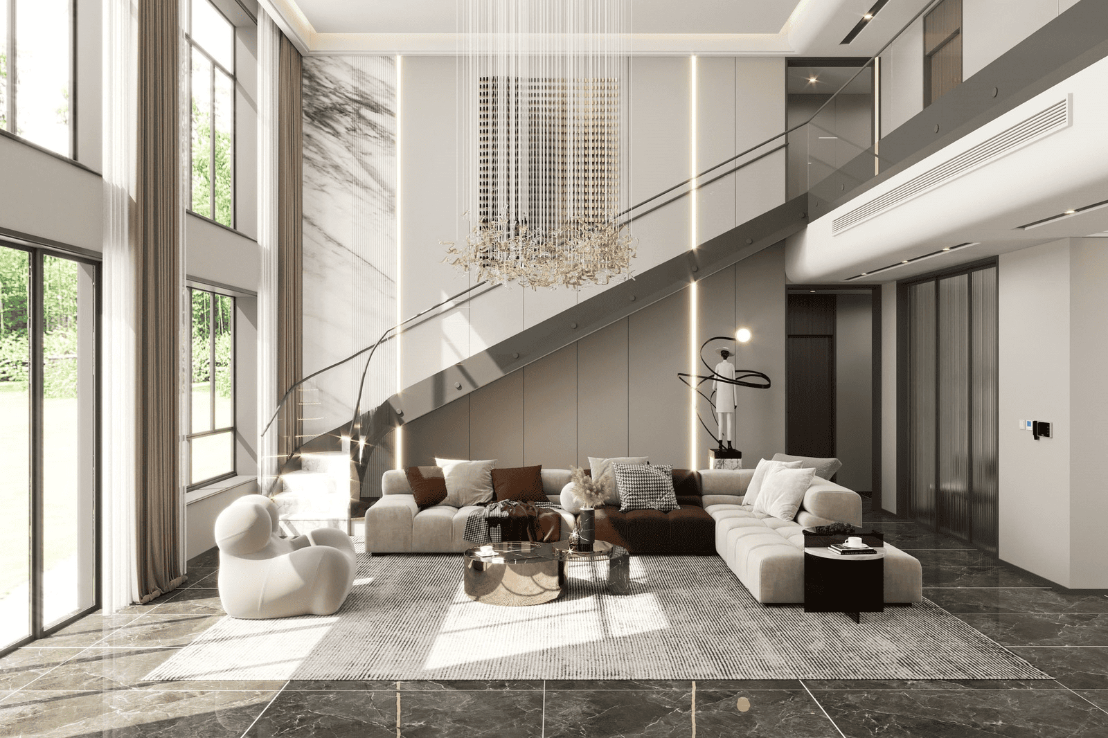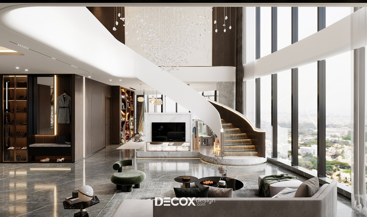 Phòng khách thông tầng được thiết kế theo tư duy kiến trúc đa lớp, khai thác không gian theo phương đứng với trần cao hai tầng tạo cảm giác mở và thoáng. Ánh sáng tự nhiên đóng vai trò chính, được đưa vào qua hệ cửa kính lớn hoặc giếng trời, giúp làm rõ cấu trúc kiến trúc và nhịp không gian. Mặt đứng nội thất được xử lý xuyên tầng thông qua các mảng vách lớn, kính cao hoặc đèn thả dài, thay vì sử dụng những chi tiết trang trí nhỏ. Trục nhìn thường được dẫn theo chiều cao hoặc gắn với cầu thang như một thành phần kiến trúc trung tâm.