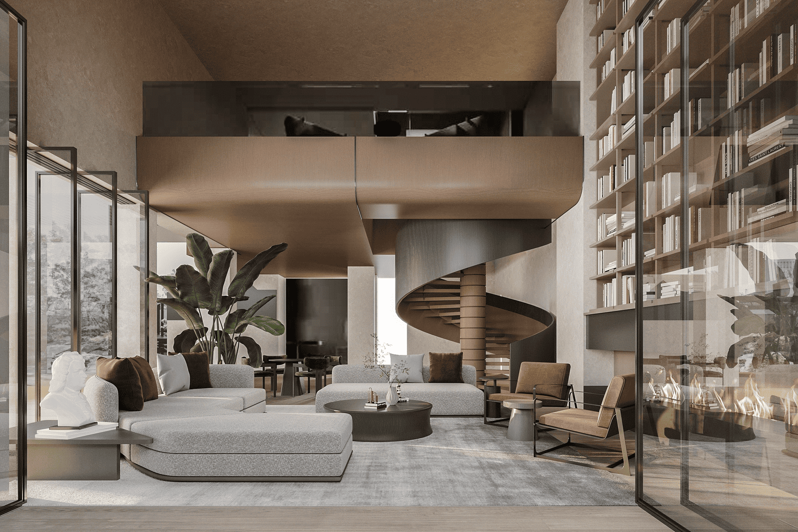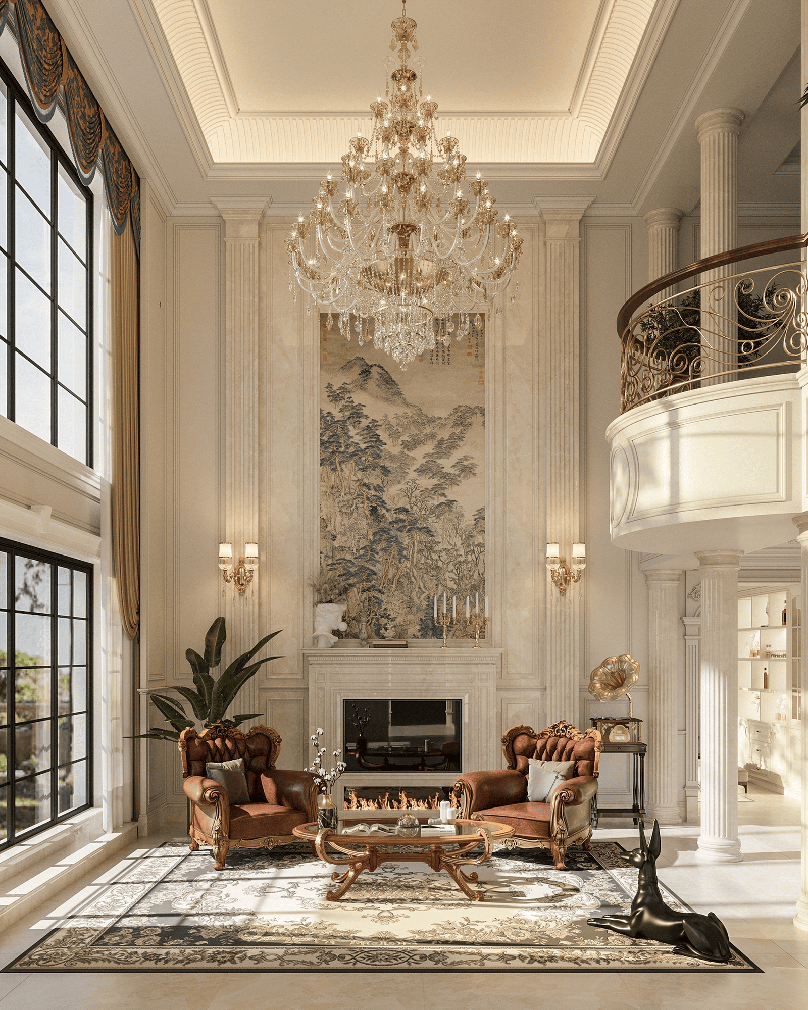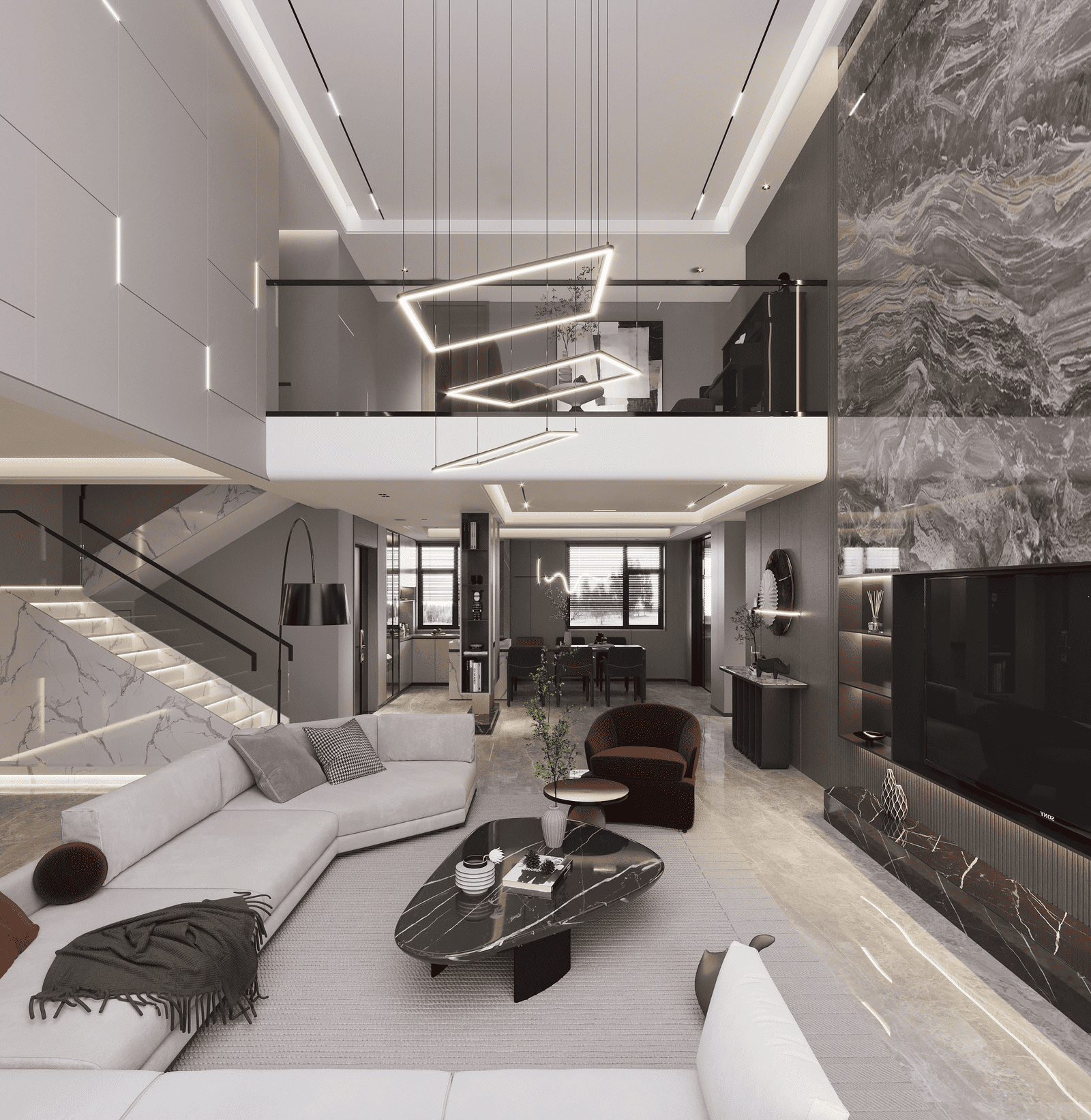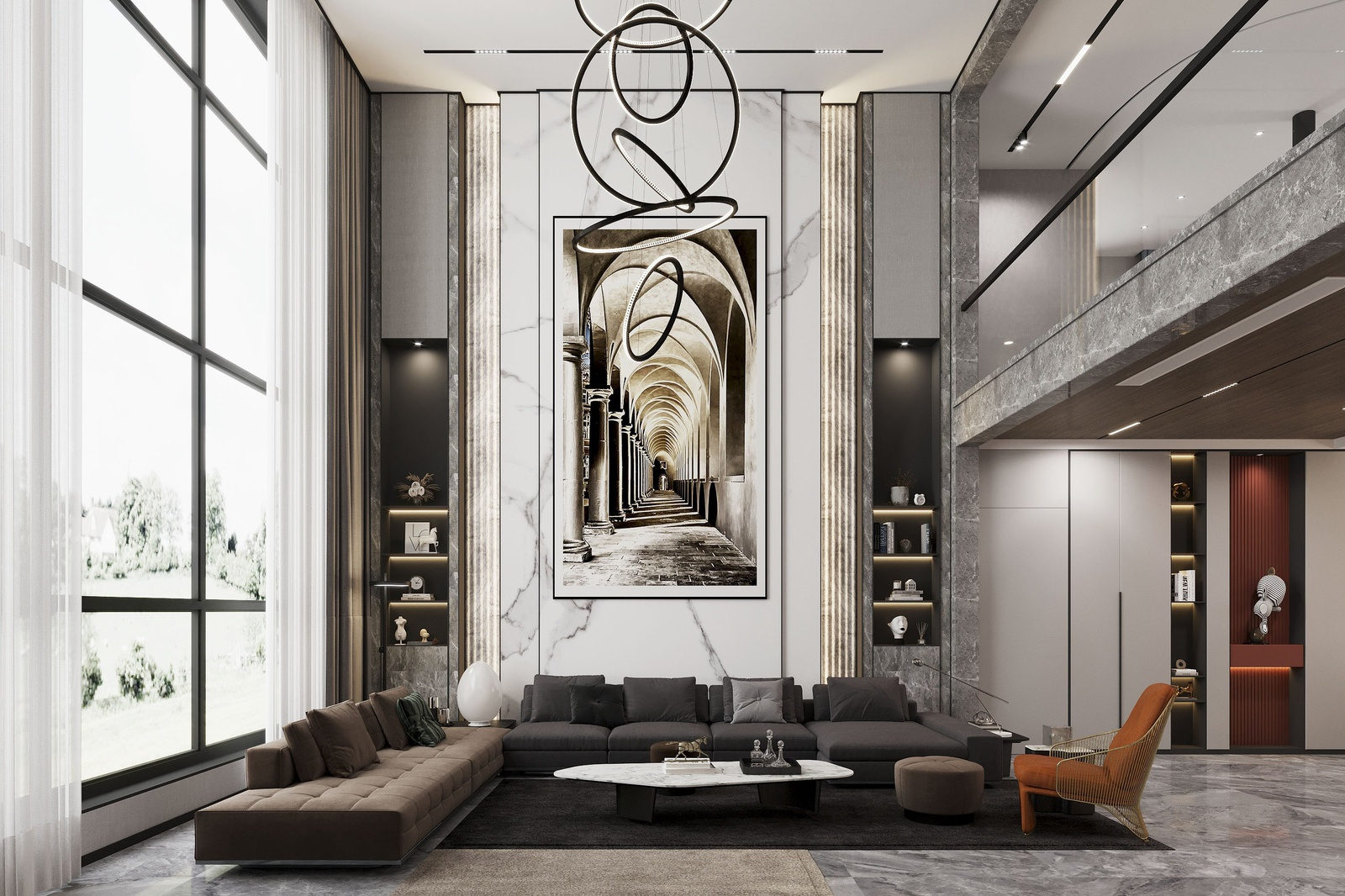 Phòng khách thông tầng được thiết kế theo tư duy kiến trúc đa lớp, khai thác không gian theo phương đứng với trần cao hai tầng tạo cảm giác mở và thoáng. Ánh sáng tự nhiên đóng vai trò chính, được đưa vào qua hệ cửa kính lớn hoặc giếng trời, giúp làm rõ cấu trúc kiến trúc và nhịp không gian. Mặt đứng nội thất được xử lý xuyên tầng thông qua các mảng vách lớn, kính cao hoặc đèn thả dài, thay vì sử dụng những chi tiết trang trí nhỏ. Trục nhìn thường được dẫn theo chiều cao hoặc gắn với cầu thang như một thành phần kiến trúc trung tâm.