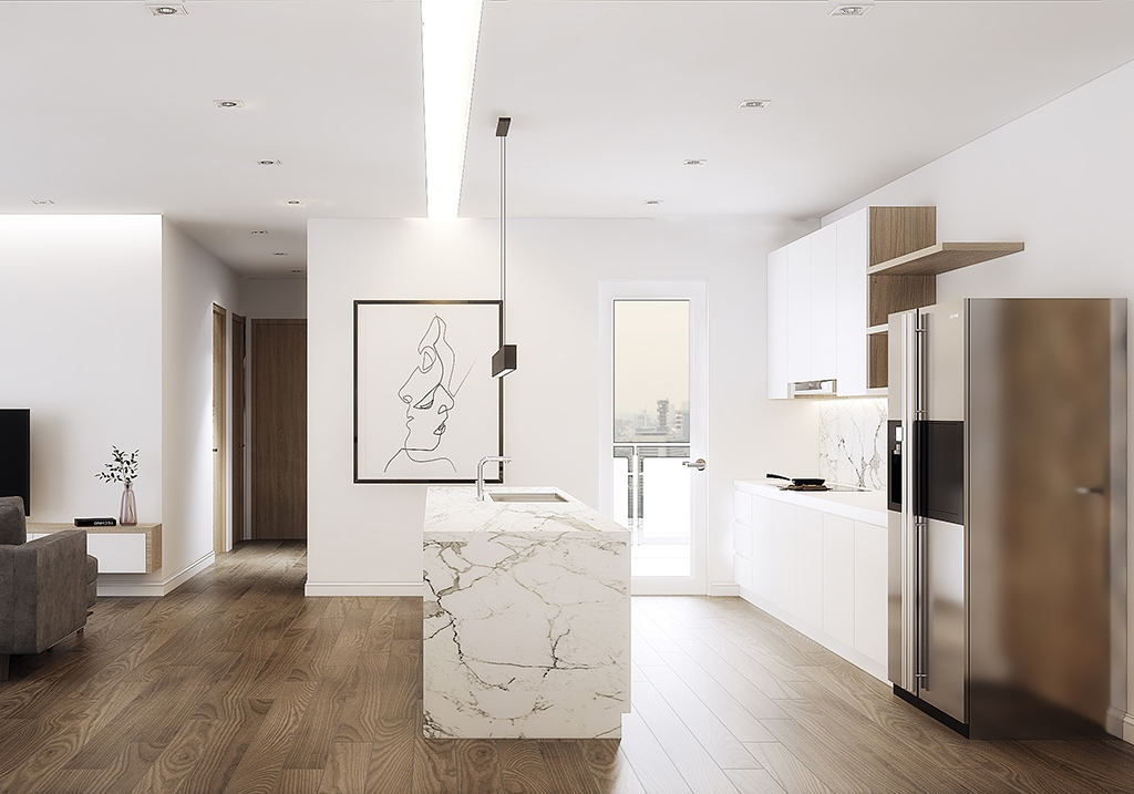 Phòng khách liền bếp theo tư duy không gian mở, giữ thông thoáng và không chia cắt bằng vách ngăn cứng, yếu tố dễ làm không gian bị vụn. Phân khu thực hiện bằng các giải pháp mềm như đảo bếp hoặc quầy bar, thảm trải sàn và xử lý trần và ánh sáng theo lớp, xác lập ranh giới chức năng nhưng vẫn giữ sự liền mạch. Về bố cục, lối đi nên chạy dọc theo biên để luồng di chuyển không cắt ngang khu vực ngồi.