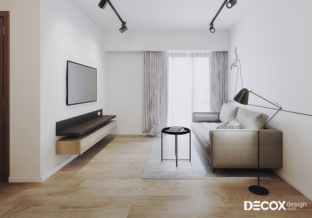 Nội thất lựa chọn theo tiêu chí vừa đủ và linh hoạt, ưu tiên dáng thấp, kích thước nhỏ gọn (sofa chữ I/L nhỏ) và nội thất đa năng. Về hoàn thiện, trần phẳng hoặc giật cấp nhẹ kết hợp ánh sáng bố trí đồng đều giúp căn hộ sáng và thoáng hơn, trong khi vật liệu và màu sắc thiên về gam sáng, bề mặt đơn giản để tạo hiệu ứng mở rộng không gian và tăng sự thoải mái khi sử dụng.