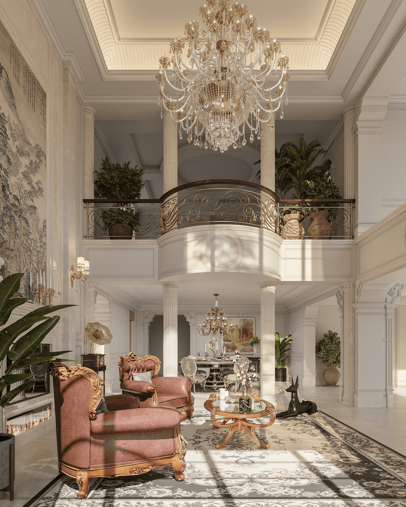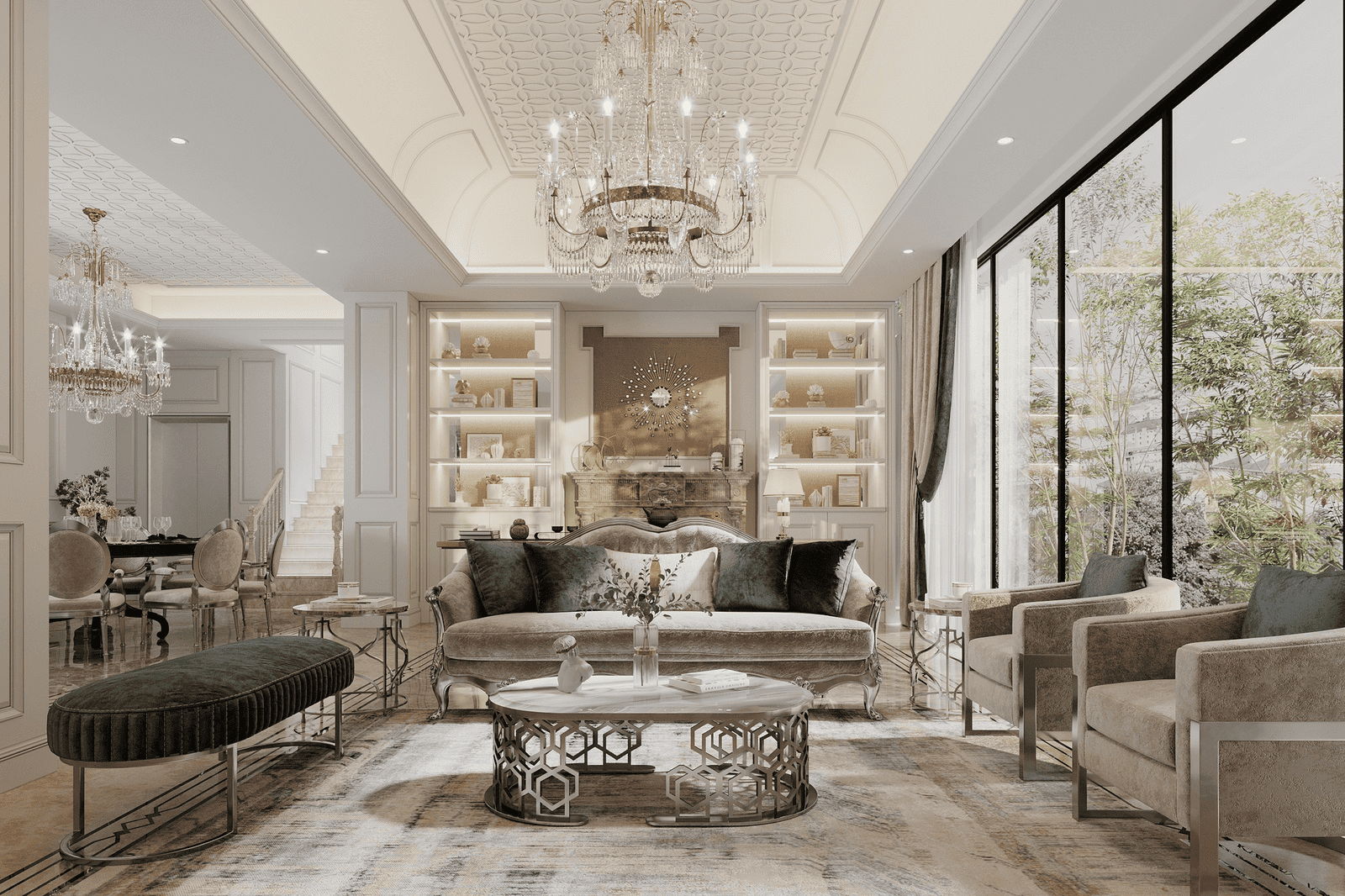 Nội thất thường được bố trí “đủ bộ” để giữ trọn ngôn ngữ phong cách, kết hợp các chi tiết phào chỉ, đường cong và bề mặt nổi nhằm tạo chiều sâu thị giác thông qua hiệu ứng ánh sáng và bóng đổ. Gam màu sáng như trắng, kem, đi cùng điểm nhấn vàng đồng và đá bóng hoàn thiện bóng giúp không gian phản xạ ánh sáng tốt hơn, từ đó tạo nên vẻ sang trọng theo cách bền vững và có kiểm soát.