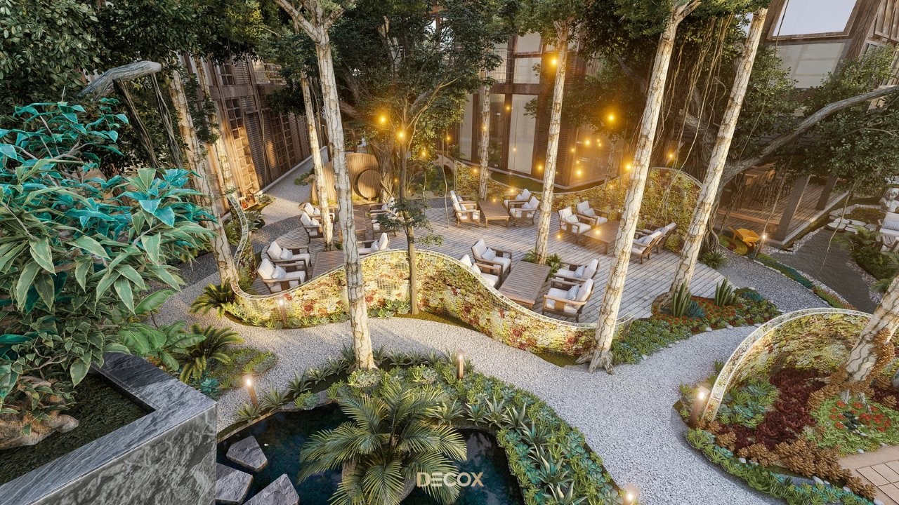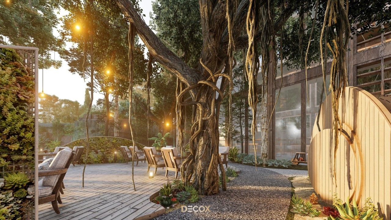 Thiết kế quán cà phê sân vườn dù triển khai trên diện tích 100m² hay quy mô lớn hàng nghìn mét vuông, điểm cốt lõi nằm ở triết lý quy hoạch "dòng chảy không gian" và nghệ thuật phân khu mạch lạc xóa bỏ ranh giới giữa con người và thiên nhiên. Phong cách thiết kế thường hướng đến Tropical, Rustic hay Zen để tạo dựng một "ốc đảo" tĩnh tại giữa phố thị.