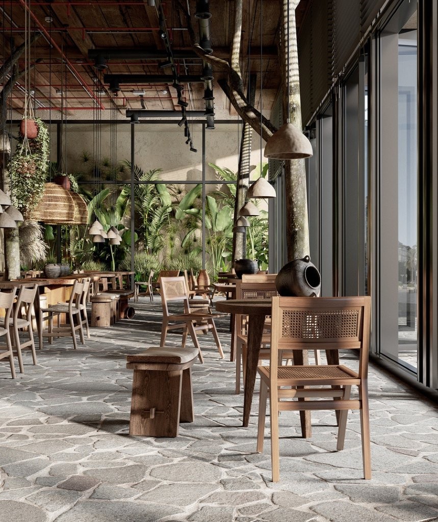 Yếu tố thiết kế chính nằm ở những đường nét hữu cơ, các họa tiết thổ cẩm và nghệ thuật đan thắt Macramé tinh xảo kết hợp nét thô mộc của mây, tre, gỗ mộc giao thoa hoàn hảo với sự mềm mại của các loại vải dệt, lanh và da thuộc tạo nên một "dòng chảy vật liệu" giàu tính tự sự. Triết lý phân khu chức năng theo lối dòng chảy tự do, nơi ranh giới giữa các khu vực được phân định mềm mại bằng thảm trải sàn hoặc cây xanh Biophilic, góc ngồi bệt thư thái, hay sofa thấp tầng để tối ưu hóa cảm giác nghỉ dưỡng và riêng tư, định vị bản sắc thương hiệu đầy sức sống, đánh thức mọi giác quan của thực khách ngay từ điểm chạm thị giác đầu tiên.