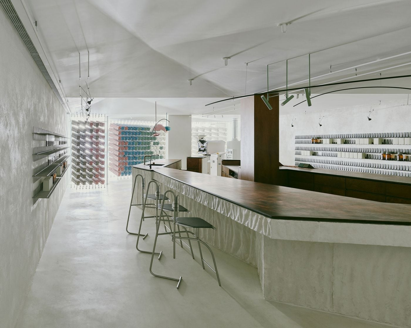 Việc ứng dụng các giải pháp "thiết kế mở" và hệ thống vách ngăn ước lệ (như cây xanh, kệ trưng bày) giúp không gian luôn thông thoáng. Các vật liệu như gỗ tự nhiên, kim loại mạ mờ hay đá khối kết hợp hệ thống ánh sáng riêng cho từng khu vực: từ ánh sáng rọi làm nổi bật sản phẩm trưng bày đến ánh sáng vàng ấm tại khu vực cà phê, tách biệt rõ ràng các khu vực, hỗ trợ và tôn vinh lẫn nhau, giúp không gian luôn thông thoáng, mạch lạc, mang lại cảm giác bề thế và chuyên nghiệp.