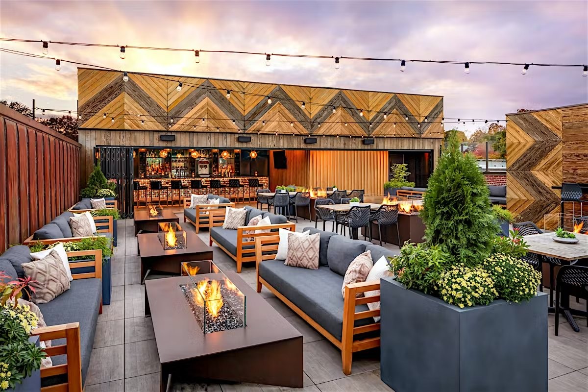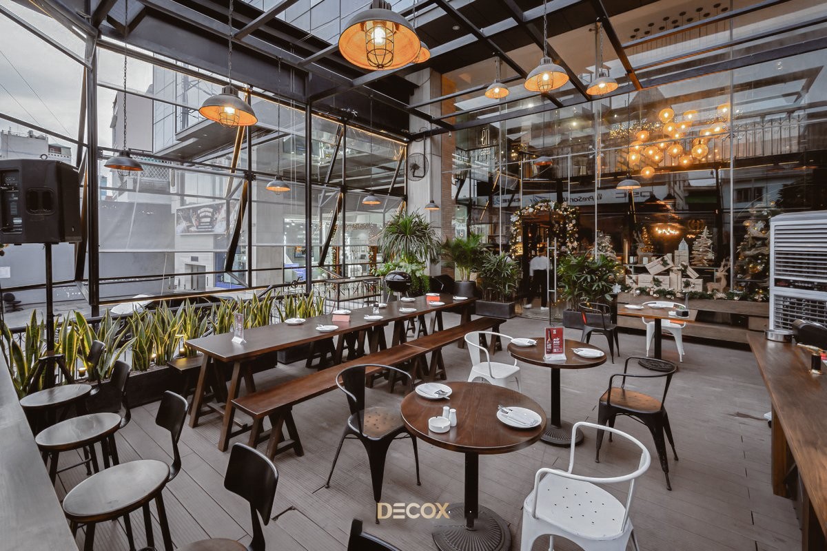 Thiết kế quán cà phê trên sân thượng là nghệ thuật kiến tạo một "biểu tượng trên cao" đầy kiêu hãnh nhờ khả năng khai thác triệt để ưu thế về tầm nhìn Panorama 360 độ. Ngôn ngữ thiết kế ưu tiên xóa bỏ ranh giữa không gian quán cafe và bầu trời, với hệ thống kính cường lực không chia đố và lan can kính tràn viền phô diễn trọn vẹn sự bề thế và đẳng cấp ngay từ điểm chạm thị giác đầu tiên. Không gian được phân khu chức năng linh hoạt: khu vực quầy bar làm trung tâm, khu vực ngồi khách được ngăn cách bởi hệ thống mái che linh hoạt và vách kính chắn gió.