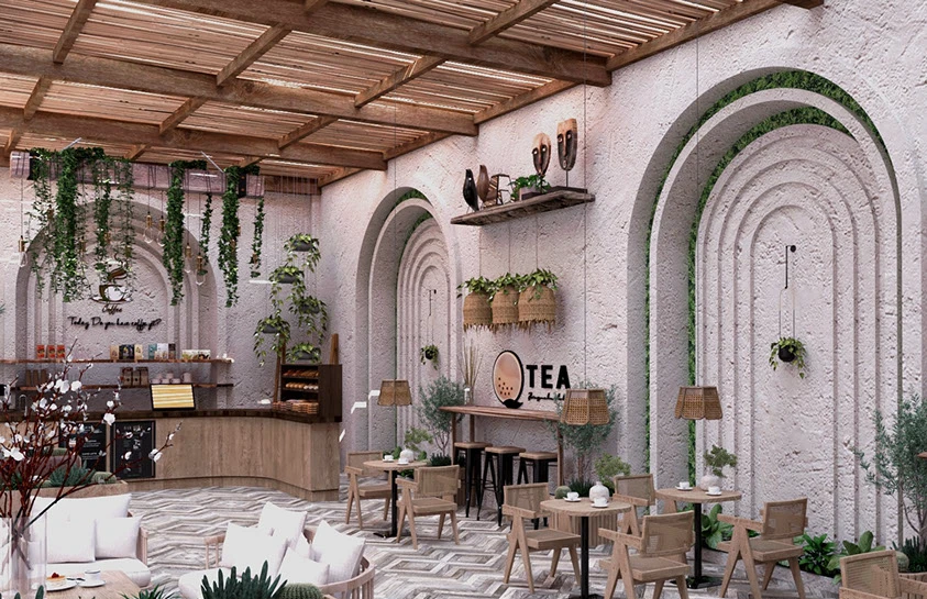 Thiết kế quán cafe phong cách Địa Trung Hải là nghệ thuật làm chủ các hình khối vòm cong đặc trưng kết hợp cùng mảng tường trắng sứ hoặc màu đất nung đầy tính biểu tượng. Triết lý quy hoạch không gian mở, ánh sáng tự nhiên và các mảng xanh Biophilic như xương rồng hay giàn hoa giấy kết hợp nghệ thuật ánh sáng đa tầng làm nổi bật vật liệu nội thất, giúp quán trở thành một “thỏi nam châm thị giác”, định vị bản sắc thương hiệu là một không gian sống đầy cảm hứng và kiêu hãnh ngay giữa phố thị.