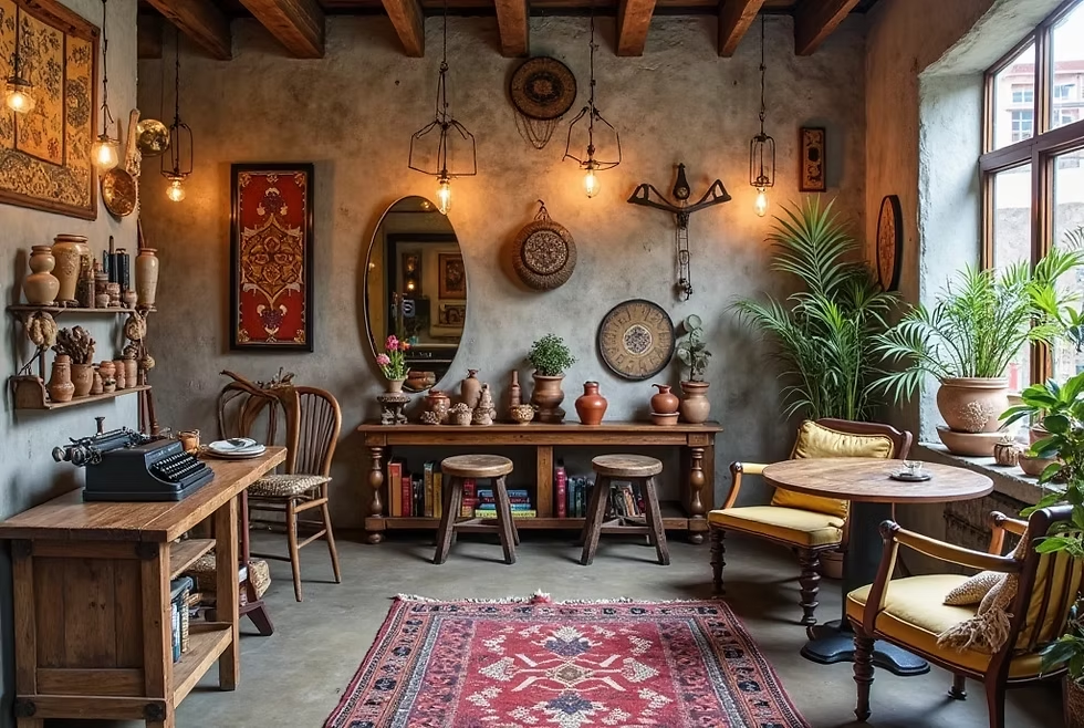 Thiết kế quán cafe phong cách Bohemian đề cao sự phóng khoáng, cá tính và tinh thần "Joie de vivre". Bảng màu đặc trưng của phong cách là sự giao thoa giữa các tông màu đất ấm áp (Terracotta, vàng mù tạt, nâu gỗ) làm "phông nền", kết hợp cùng các điểm nhấn rực rỡ từ sắc đỏ ruby, xanh ngọc bảo hay tím thẫm đầy cảm hứng, nơi sự ngẫu hứng được sắp đặt một cách có tính toán.