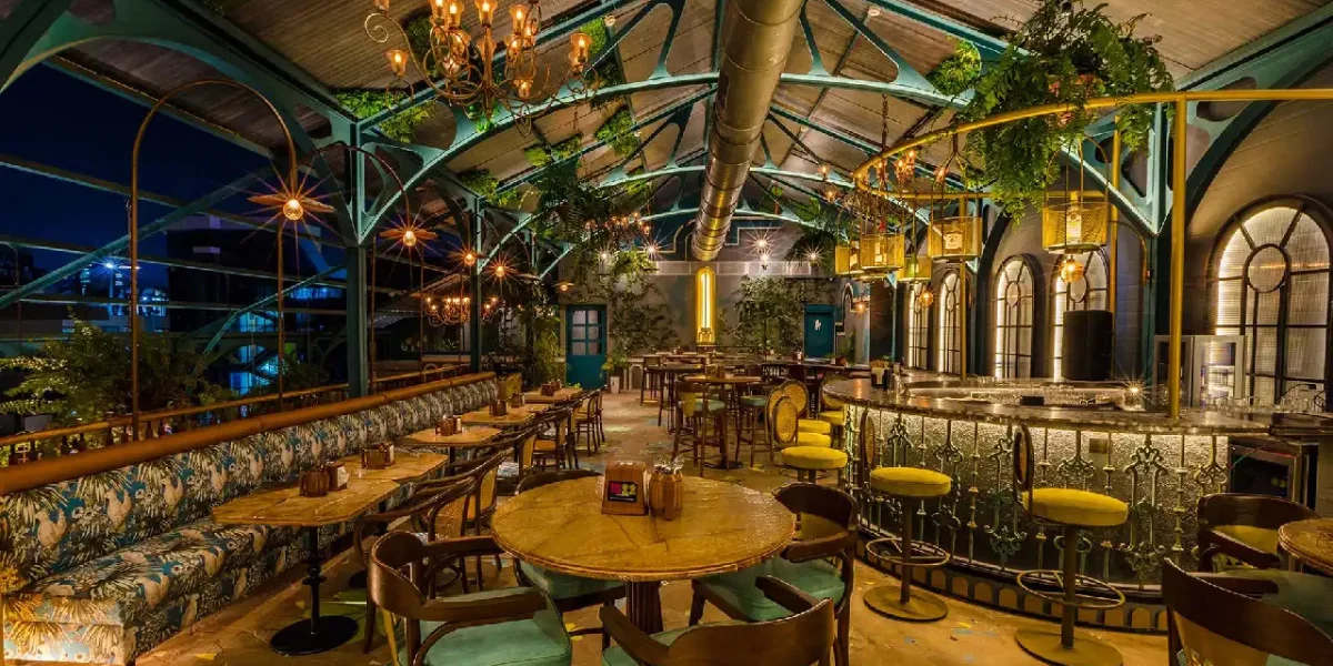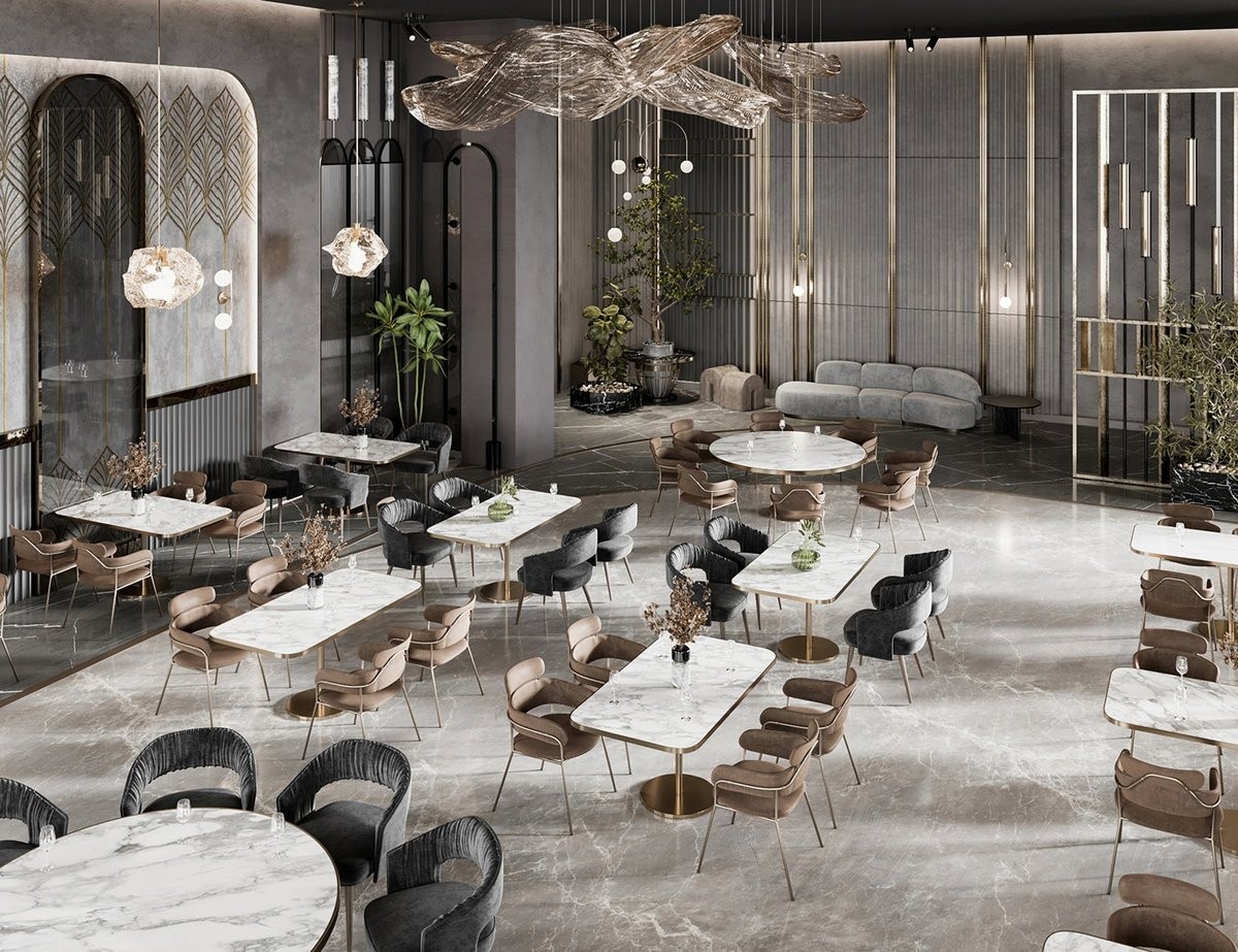 Triết lý phân khu chức năng theo hướng "đa trung tâm", tách biệt khéo léo giữa khu vực quầy bar và những góc ngồi "Boudoir" riêng tư. Vật liệu nội thất mang tính biểu tượng của sự xa hoa của đá Marble, inox gương mạ PVD vàng, gỗ tự nhiên và chất liệu nhung, kết hợp giữa ánh sáng tự nhiên từ những ô cửa vòm lớn và hệ đèn chùm pha lê tinh xảo cùng đèn tường ấm áp kiến tạo nên một không gian đầy chiều sâu kiến trúc.