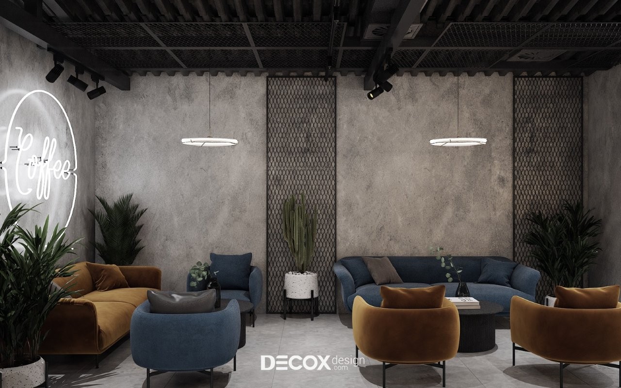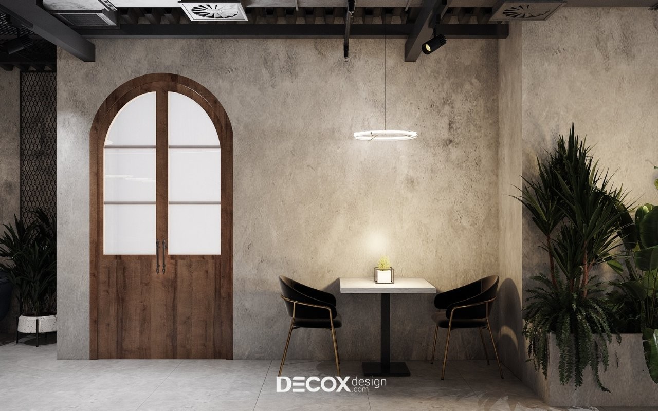 Thiết kế quán cafe phong cách công nghiệp mô phỏng các công xưởng cũ, thông qua những cấu trúc nguyên bản, mạnh mẽ, dứt khoát và đầy tính tự sự của không gian. Bảng màu đặc trưng lấy cảm hứng từ những vật liệu đô thị: Xám bê tông, Đen của sắt sơn tĩnh điện, màu Nâu trầm của gỗ lâu năm và sắc Đỏ gạch nung. Khu vực trung tâm được đặt tại quầy Bar theo lối "mở và bề thế" để tận dụng tối đa chiều cao tầng. Hệ thống vật liệu nội thất đặc bản có độ tương phản cao, theo hướng cơ khí của đường ống chạy nổi, cột bê tông trần và những mảng tường gạch mộc. Sự kết hợp giữa đèn rọi ray và ánh sáng vàng ấm từ những bóng đèn Edison sợi đốt kiến tạo nên một không gian giàu cảm xúc giữa những mảng vật liệu khô khan, khơi gợi sự tò mò và ấn tượng mạnh mẽ cho khách hàng ngay từ điểm chạm đầu tiên.