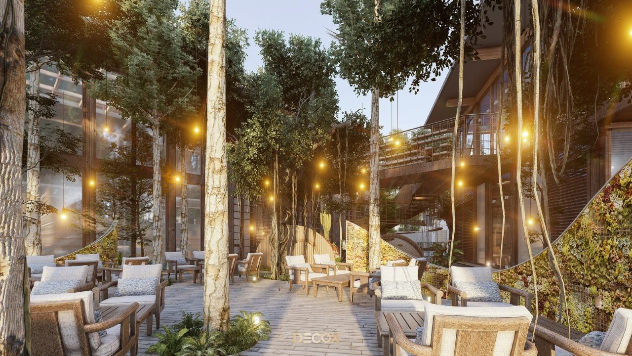 Thiết kế quán cà phê sân vườn bố trí đa dạng các khu vực ngồi từ không gian mở đến các góc riêng tư giúp tối ưu hóa công suất phục vụ mà vẫn đảm bảo trải nghiệm cá nhân hóa. Hệ thống nội thất được ưu tiên sử dụng các vật liệu như gỗ tự nhiên, đá khối, mây tre đan cao cấp, thay thế hoàn toàn cho các vật liệu kim loại thô cứng. Sự tương kết giữa bàn ghế ngoài trời chuyên dụng, các tiểu cảnh hồ nước, thác đá và tận dụng tối đa ánh sáng mặt trời vào ban ngày và nghệ thuật ánh sáng "chill" vào ban đêm, trở thành điểm đến lý tưởng cho các gia đình và nhóm bạn tìm kiếm sự kết nối trong một không gian nghỉ dưỡng thực thụ.