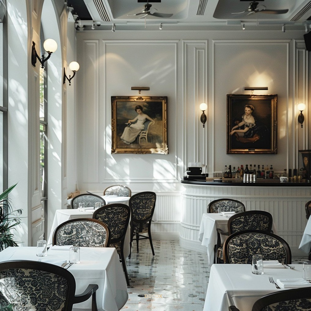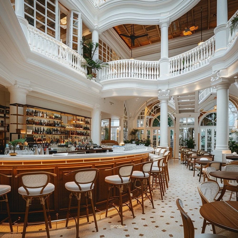 Thiết kế quán cafe phong cách tân cổ điển là bản giao hưởng giữa vẻ đẹp hoài cổ quý tộc và tư duy công năng hiện đại trong "nghệ thuật tỷ lệ vàng" các mảng tường với hệ thống phào chỉ thanh mảnh và những đường gờ chạy dọc đầy tính toán. Bảng màu đặc trưng ưu tiên những tông màu quý phái như Trắng sứ, Kem, Beige làm chủ đạo, kết hợp cùng các điểm nhấn vương giả từ xanh Navy, xám tro hoặc vàng đồng.